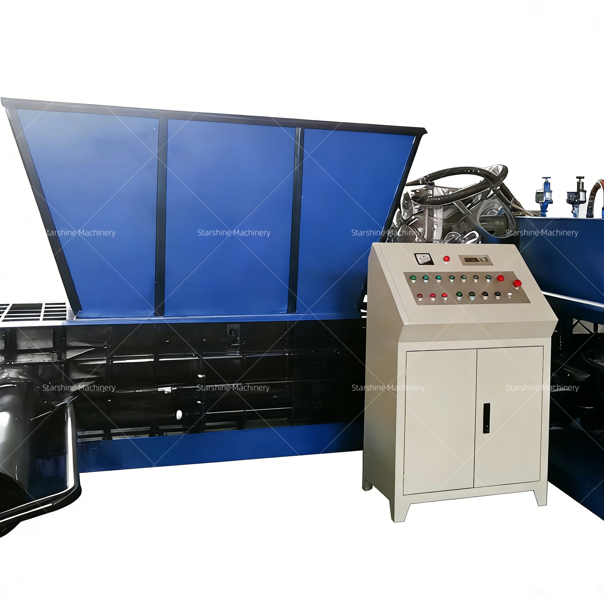 2. Strutture chiave: tramoggia (ampia apertura, anti-ponte), camera di compressione (piastra di rivestimento resistente all'usura), cilindro di pressione principale, meccanismo di apertura della porta/spinta laterale, stazione idraulica (pompa/valvola/serbatoio dell'olio), armadio di controllo elettrico (PLC/HMI), serbatoio di raccolta dell'olio (speciale per rottami).
